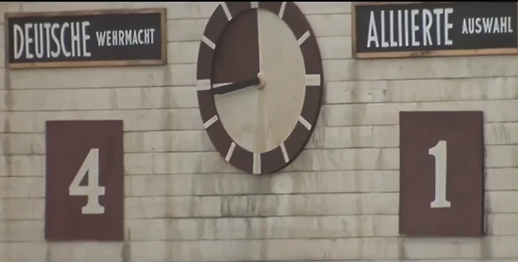 Конечно, у них получается закамбэчить. Итоговый счет на табло 4-4, причем один из голов пленных не засчитан. Так и получается та самая «победа», как говорится у нас, «народная», когда счет на табло не соответствует действительности, хотя все всё понимают. Свой момент славы получил и Хэтч. Сталлоне изначально хотел забить решающий гол, но он ведь вратарь, такое вряд ли возможно (хотя казалось бы, кино). Но нет, вместо этого он отбивает пенальти немцев в самом конце матча. После финального свистка зрители с трибун выбегают на поле с криками «Победа!», помогая команде в конце концов сбежать. Титры.
