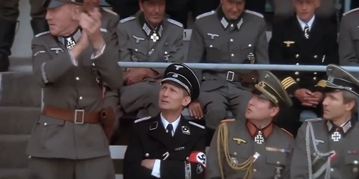 Фон Штайнер единственный из всех офицеров-немцев радуется голу, который вообще-то забил соперник. Почему? Видимо, потому что он - бывший футболист. Он оценил красоту игры и чисто спортивную составляющую.