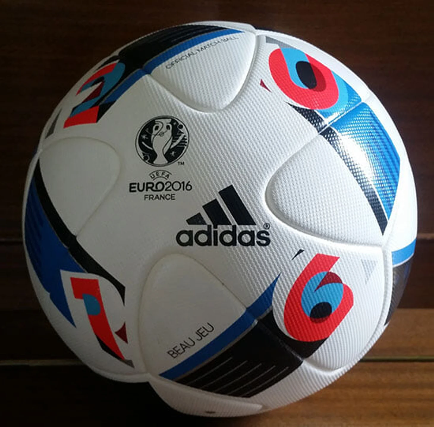 Евро-2016 проводился во Франции, поэтому мяч назвали Beau Jeu («Красивая игра»). Модель выполнена в цветах французского триколора и по конструкции близка к мячу Brazuca, которым играли на ЧМ-2014.