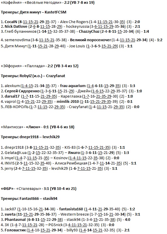 5. jerry (2-4-7-11-15-32-35) - levchik29(1-6-7-11-15-21-35) 1:1