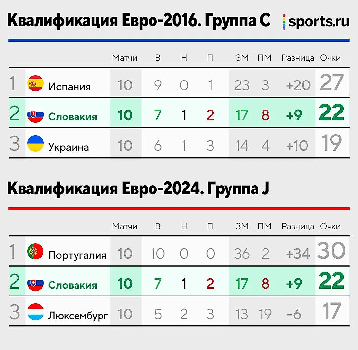 Сейчас за первый круг Словакия дважды теряла очки дома – 0:0 с Люксембургом и 0:1 от Португалии. Но во втором круге обыграла всех кроме португальцев и вышла досрочно – за тур до конца.