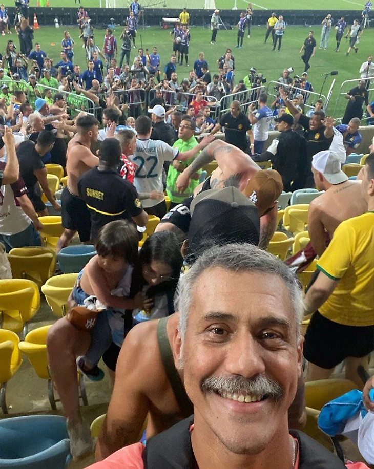 В соцсетях завирусилось селфи одного из болельщиков, жизнерадостно фотографировавшегося на трибунах «Мараканы», в то время как за его спиной идет ожесточенная драка болельщиков и полиции.
