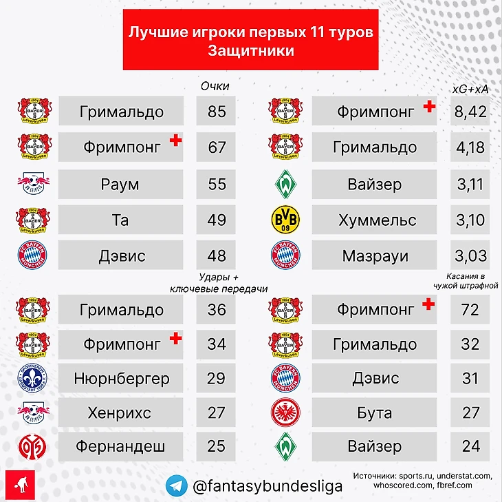 Даник: Фримпонг (Байер) – 7.0 (игрок травмирован), Гримальдо (Байер) – 6.5, Раум (РБ Лейпциг) – 6.5, Хенрихс (РБ Лейпциг) – 6.0