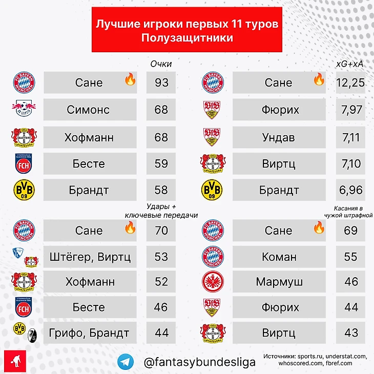 Даник: Сане (Бавария) – 8.5, Ундав (Штутгарт) – 7.0, Симонс (РБ Лейпциг) – 8.0, Мармуш (Айнтрахт) – 7.0, Плеа (Боруссия М) – 7.5, Брандт (Боруссия Д) – 8.5, Грифо (Фрайбург) – 9.0