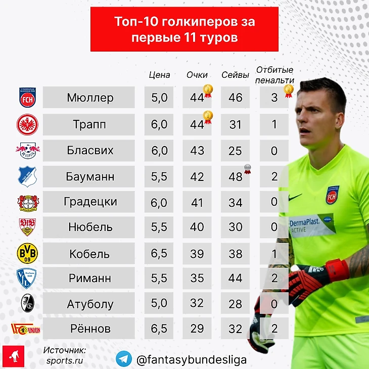 Porqué: На мой взгляд, в Бундеслиге это не самая ключевая позиция. Сухие матчи бывают не часто даже у лидеров, а у остальных тем более. У меня с начала сезона пара Атуболу-Мюллер (оба за 5.0), вполне устраивает.