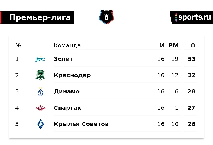 Вот так теперь выглядит первая пятерка после 16 игр.