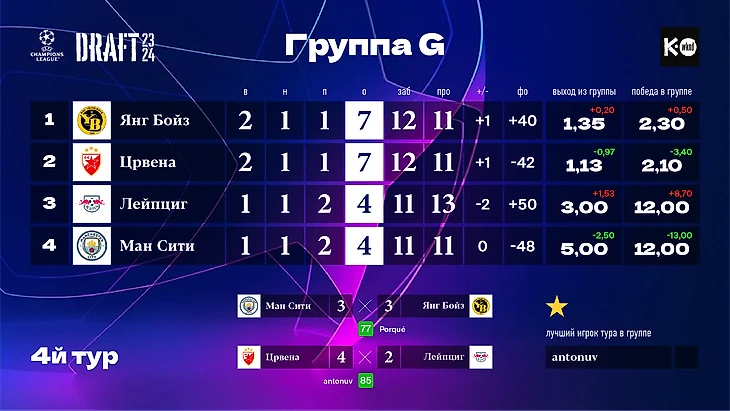 Три интересных факта группы: 1. Миша Фантазевич - 3 замены - ок, Альварес - кэп - ок, а результат - совсем не ок(, худший в туре - 29 ФО 2. Но благодаря остальным парням Манчестер Сити не проиграл, ничья позволяет бороться дальше!, пожелаем удачи 3. Црвена Звезда, каким то чудом, без особых попаданий (не увидел ничего такого), взяла победу в важном матче, лакерки?, поздравляем. ГМ Donskoy61 идет 4-0-0 - красава!