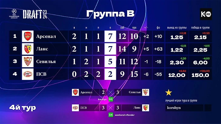 Три интересных факта группы: 1. Еще одна группа, где пока ничего не понятно, а помог этому проигрыш Арсенала. Но это не удивительно, так как Севилья показала топ-3 результат в туре. В паре Шваба и PJLby все мог испортить Рэш, но другой пик с этой же команды в атаке зарешал (в отличие от реальности, где его голов не хватило) 2. Billy Blaidd, видимо после моего замечаний в прошлом посте), был заморожен, но это видимо не помогло, но мне приятно) возможно 3. ПСВ уцепился за последний шанс. Две заморозки, одна из которых видно вышла удачная, -21 общее ФО, но ничья - помогли всё те же Мората, Вини и .. Эванилсон