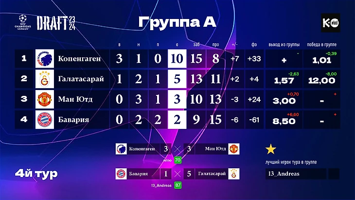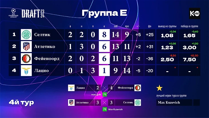 Три интересных факта группы: 1. «У нас самая непредсказуемая группа, а потому сложная. Костя всегда хорош на драфтах.», сказал Алекс и проиграл ему 2 матча, похоронив свои шансы 2. Лидеры и в ответном матче разошлись миром, так что ни Селтик, ни Атлетико не могут спать спокойно, хотя кельты в более благоприятном состоянии благодаря +2 фо 3. Фейеноорд жестко камбечит, без заморозок, без замен, на скиле) Вини кэп у derince - это пять