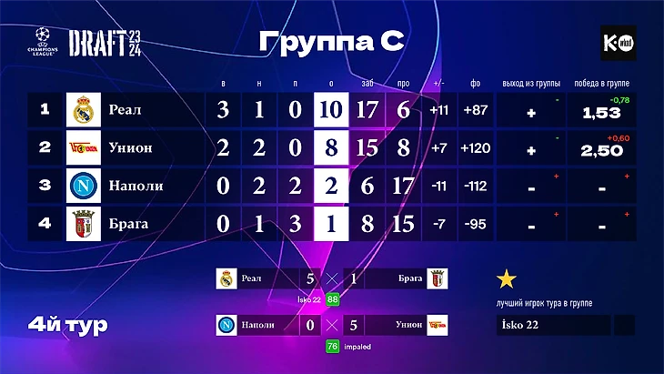 Три интересных факта группы: 1. Унион Берлин - топ-1 результат в туре, и логичная победа. В отличие от проблем реального клуба - эти показывают себя неплохо. ГМ говорил о втором месте, на нем они и есть, но борьбы уже не будет) 2. Реал Мадрид - İsko 22 - лучший игрок тура, как такое возможно? Ну так учитесь и смотрите состав мэтра - Вини (что понятно и логично) и супер оборона, не под стать соперникам, кремень 3. Брага с Наполи не попали в пики от слова совсем и вылетают из турнира