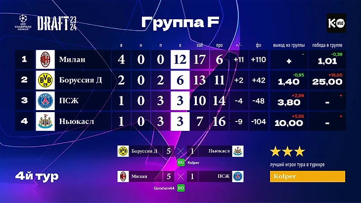 Три интересных факта группы: 1. 5-1 и 5-1, шах и мат?, ну почти. Милан 4-0-0 и это после историй драфта), топ-2 в туре, красавцы 2. Боруссия взяла важный матч, а помогли им в этом Фоден и Вини, ну в целом те же герой, это в общем-то и не особо интересный факт, интересно будет дальше 3. Ньюкасл и ПСЖ, потерпев по три поражения из четырех игр, не потеряли шансы на плов! 4. а, да! Kolper из Кастла - 0 игр за команду в старте, но топ-1 вообще в турнире, 90 фо! .. отметил