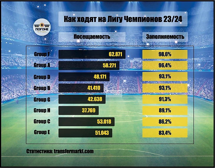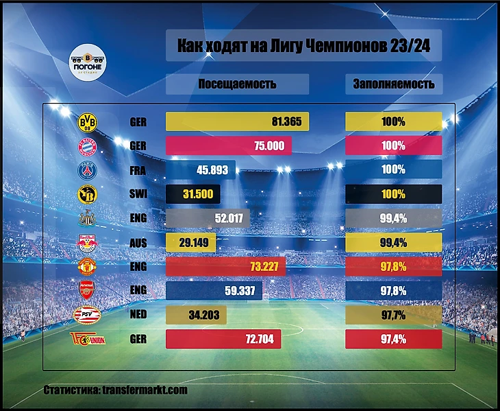 3 немецких клуба из 4 участвующих в этом сезоне ЛЧ 2023/2024 в топ-10 по заполняемости: нисколько неудивительно, ведь это и лучшая европейская лига среди топ-5.