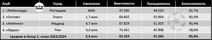 Именно показатели из столицы Италии отправили группу Е на последнее место из восьми, поскольку у трёх других клубов квартета с заполняемостью полный порядок - у всех выше 90%!