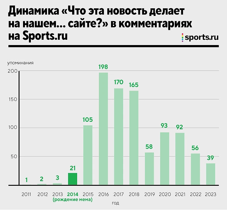 До конца 2014-го шутку использовали больше 20 раз, а уже в следующем году в пять раз больше. Пиком стал 2016-й – почти 200 упоминаний.