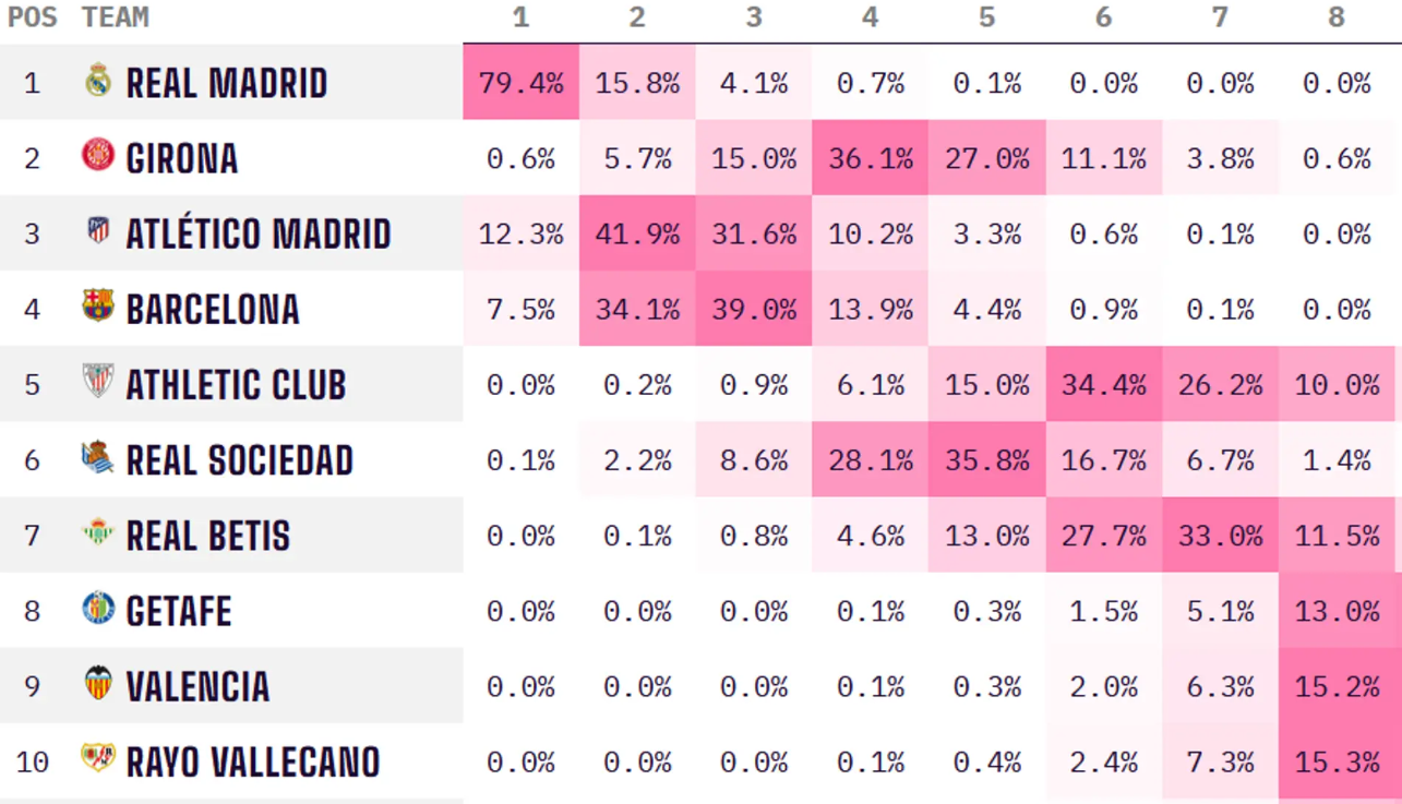 По данным этого суперкомпьютера, шансы «Жироны» на победу в Ла Лиге в этом сезоне составляют жалкие 0,6%. Хотя они твердо уверены, что финишируют в четверке лучших с показателем 36,1%.