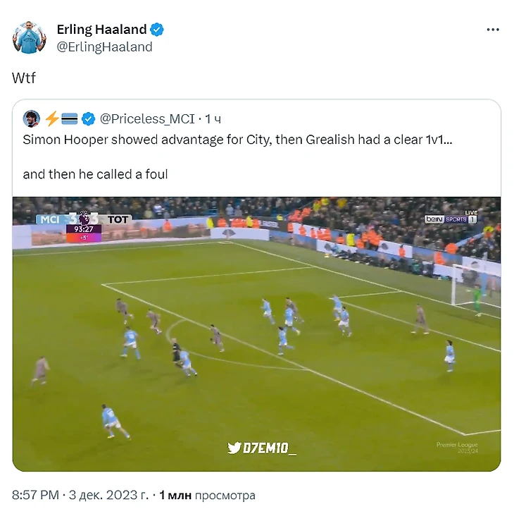 Но Хупер внезапно свистнул и назначил свободный удар с половины «Сити». Больще всех недоволен Холанд: кричал «F*** off» на судью во время игры, а после матча не остановился и выразил гнев в соцсетях: запостил видео эпизода и написал «Wtf» («какого хрена»).
