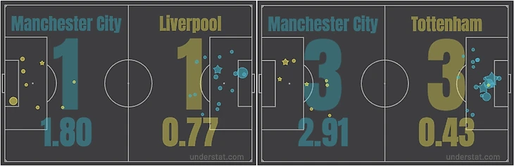 При этом сами матчи категорически отличались. Единственный настоящий провал «Сити» – последняя игра с «Астон Виллой», в которой побили кучу антирекордов. Вот карта ожидаемых голов в матчах с «Ливерпулем» и «Тоттенхэмом». «Сити» мог рассчитывать на большее: