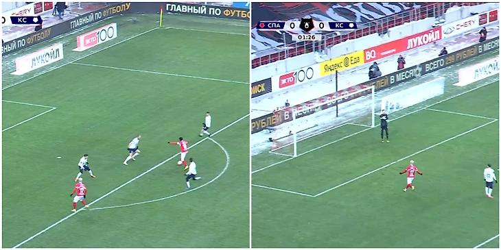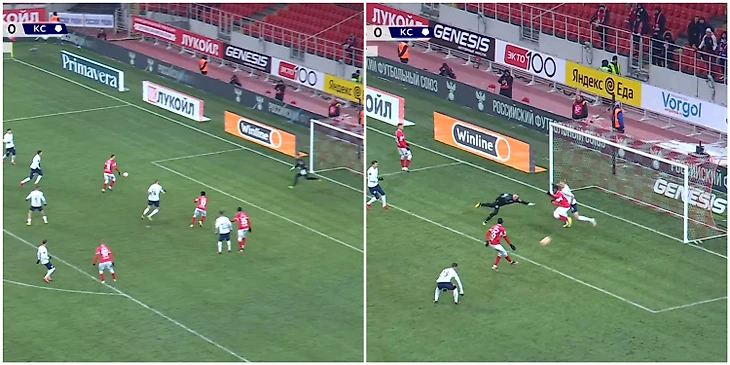 Первый тайм был очень живым – Промес попал в крестовину и штангу, Соболев опасно бил дважды за минуту, «Крылья» забили из офсайда (гол не был засчитан), а Максименко вытащил удар Рахмановича с близкого расстояния. «Спартак» перестрелял соперника по ударам в первом тайме – 9:5 и мог вести с куда более крупным счетом, чем 2:0.