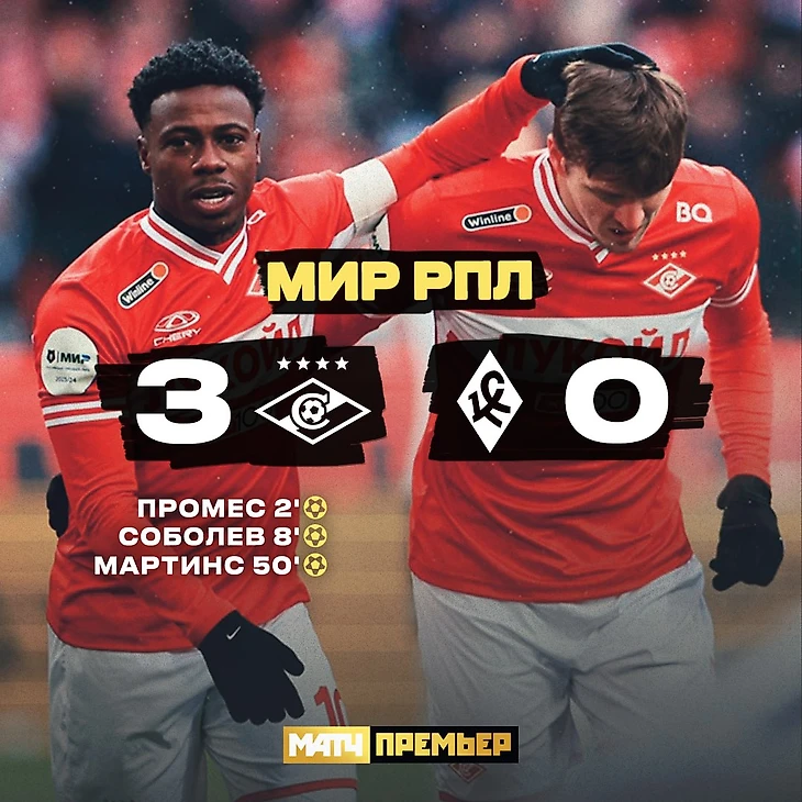Красно-белые забили два гола в начале встречи — на 2-й минуте отличился Квинси Промес, на 8-й минуте отметился Александр Соболев. На 50-й минуте Кристофер Мартинс сделал счет крупным.