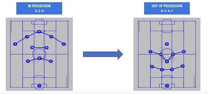 - во время владения мячом схема видоеизменяется и переходит в условные 3-2-5, где два центральных защитника выходят к опорной зоне и страхуют опорного полузащитника, фланги обороны поднимаются как можно выше к штрафной, вингеры поочередно могут подключаться к розыгрышу акккурат под штрафной, а форвард остается наконечником для завершения всех возможных эпизодов. При потере мяча во избежание опасной контратаки команда моментально опускается за центральную линию поля, превращаясь в 4-1-4-1. Линия защиты возвращается в исходное положение, опорник опускается вниз и создает вторую линию обороны, а центр поля вместе с вингерами формируют своеобразный прессингующий блок, отрезая таким образом убегающего форварда соперника от остальной команды.