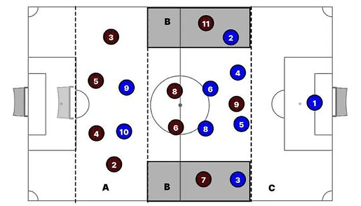 - в зоне А вся оборонительная линия встречает как минимум двух игроков нападения. Один из двух центральных защитников работает не по индивидуальному маркеру с конкретным игроком, а по всей периферии зоны, пока второй стягивается ближе к флангу - это позволяет крайним защитникам приподниматься в зону В и создавать там численное преимущество для удержания контроля за мячом. Зона С - офсайдная линия, куда по очереди забегают либо вингеры также по флангу для увлечения защитников соперника за собой и, как следствие, увеличения зоны В, подъеме офсайдной линии все глубже к воротам другой команды, что позволяет нападающему беспрепятственно выходить в штрафную и ждать там мяча.