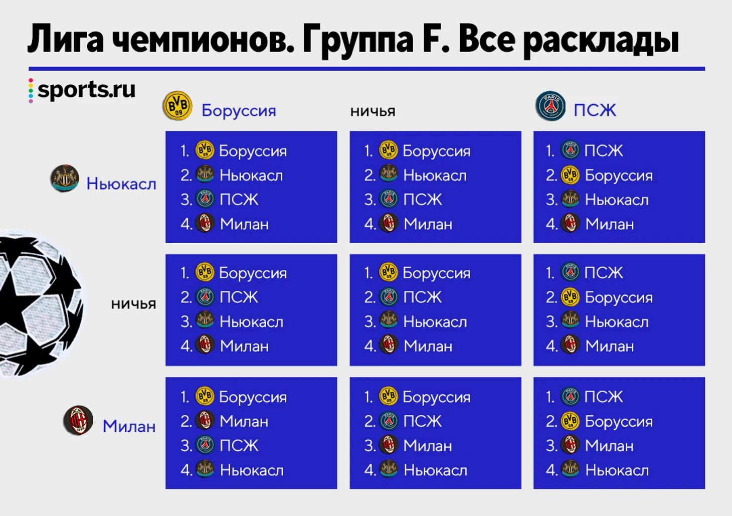 ● сыграет вничью с «Дортмундом», а в матче «Милан» – «Ньюкасл» будет либо ничья, либо победа «Милана» (у обеих команд станет по восемь очков, но «ПСЖ» будет выше из-за очных матчей – 3:0 и 1:2).