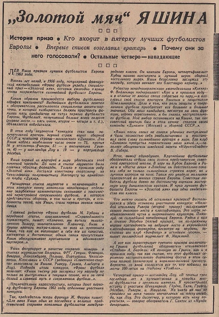 Главный редактор «Франс футбола» М. Урбини в передовой статье, озаглавленной «Справедливость торжествует», пишет: «Конечно, мы видели великолепного Замору, замечательного Планичку, были и другие вратари экстра-класса, но всех их превзошел Яшин, так как он воплощает в себе все их качества, мастерство и достижения; одним своим присутствием Яшин обескураживает противников и вдохновляет партнеров…».