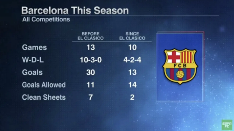 Перед "Эль Класико" каталонцы имели беспроигрышную серию во всех соревнованиях, 10 побед, 3 ничьи и 0 поражений, команда забила 30 голов и провела семь сухих матчей.