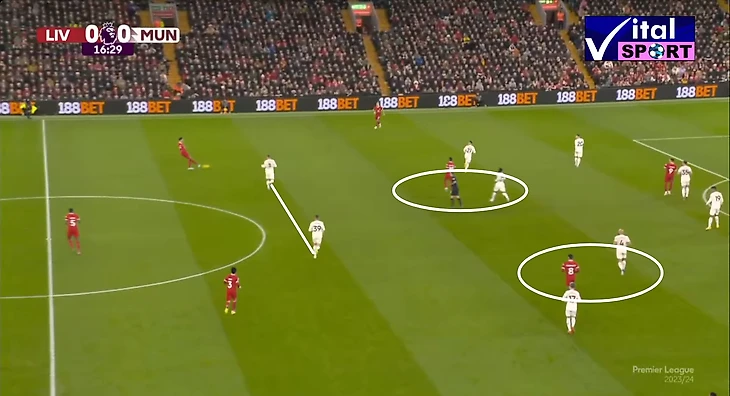 1.Два полузащитника - Майну и Амрабат играли персонально по Гравенберху и Собослаи, соответственно. Это не принесло возможной пользы, поскольку в центральной зоне всегда было несколько игроков за счёт смещений Трента и Луиса Диаса, что вынуждало разрываться полузащитников МЮ и скорее только вредило. Хёйлунд и Мактоминей перекрывали центр, но в более высоких позициях, это мешало делать вертикальные передачи центральным защитникам, но никак не ограничивало передачи с флангов, поэтому как мне кажется, было бы логичнее опустить Мактоминея ниже, для контроля смещающегося туда игрока Ливерпуля.