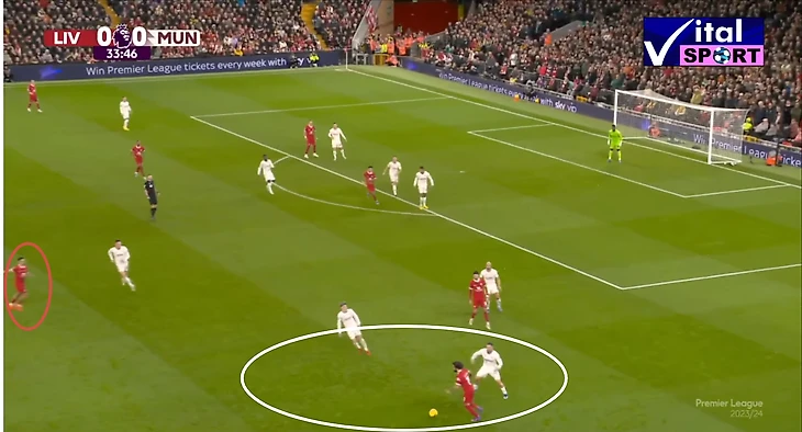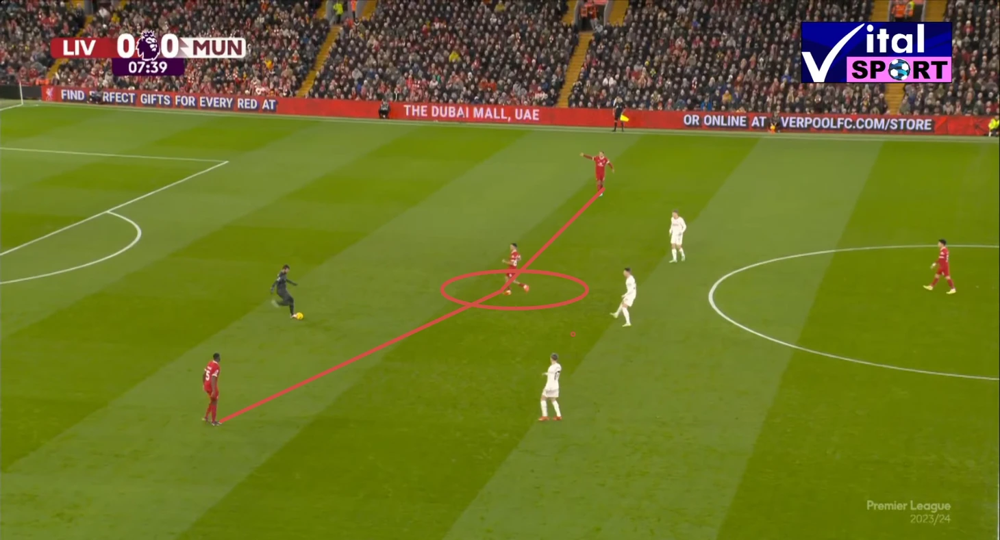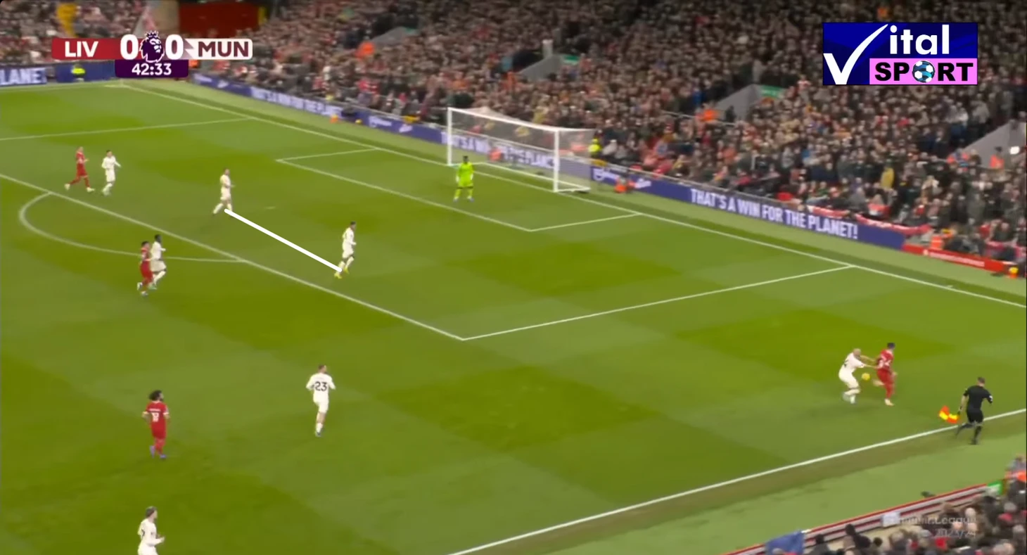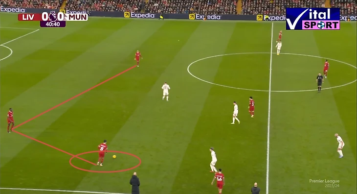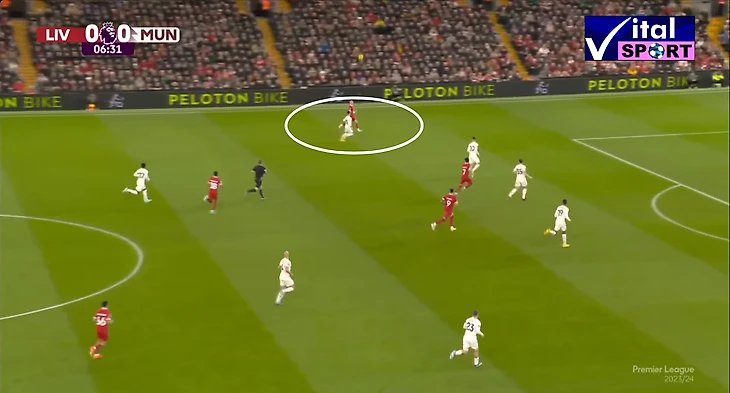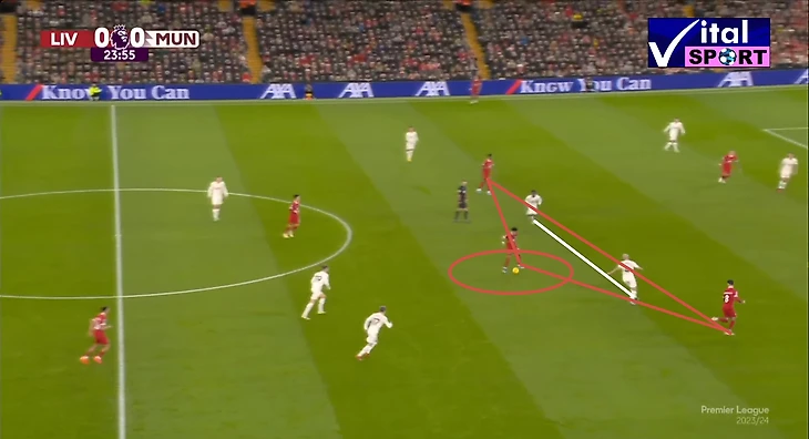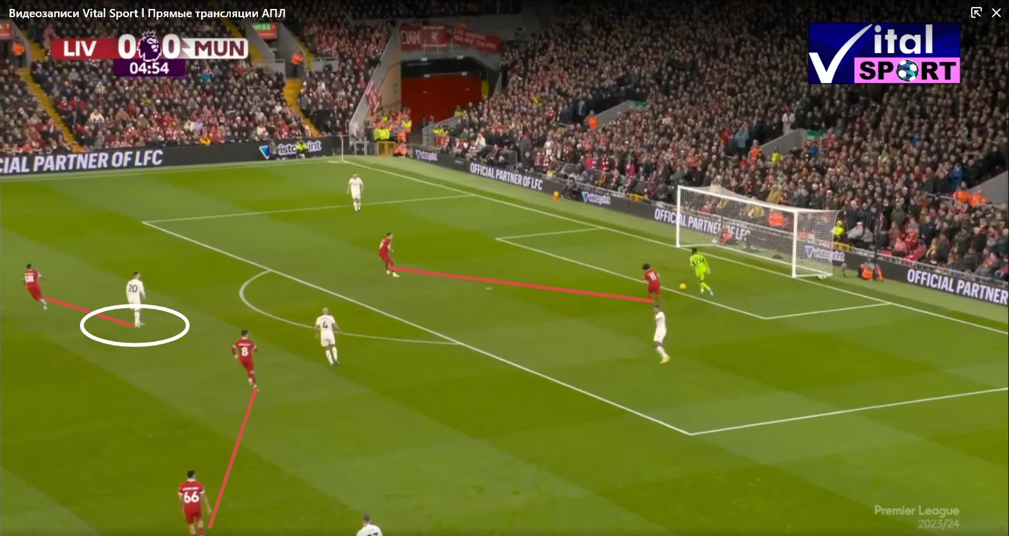 Прессинг оказался очень интенсивным, активную прессингующую группы составили: Салах и Нуньес по центру, давят на вратаря и центральных защитников, Трент и Луис Диас давят на краях, а Гравенберх и Собослаи поддерживаю прессинг также по центру. В результате такой интенсивности МЮ отказался от коротких розыгрышей, которые пытался осуществлять в начале матча, в пользу выносов мяча на Хёйлунда, Мактоминея и Майну. которые оставались в высокой позиции и старались сохранить мяч, а в дальнейшем развить атаку в направлении вингеров, которые тоже поднимались высоко.