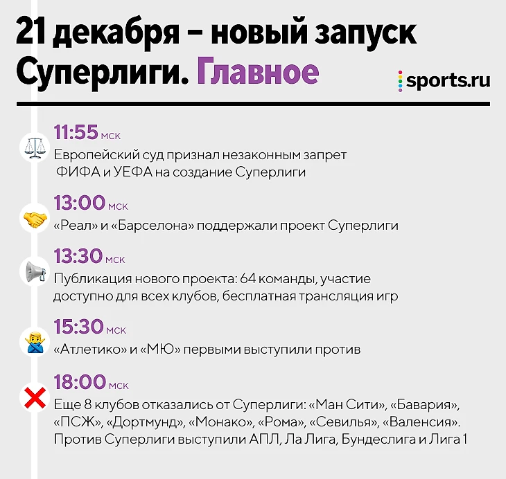 • Сразу после решения суда «Реал» и «Барселона» поддержали новый проект Суперлиги. Президент «Реала» Флорентино Перес назвал этот день великим для истории футбола и всего спорта.