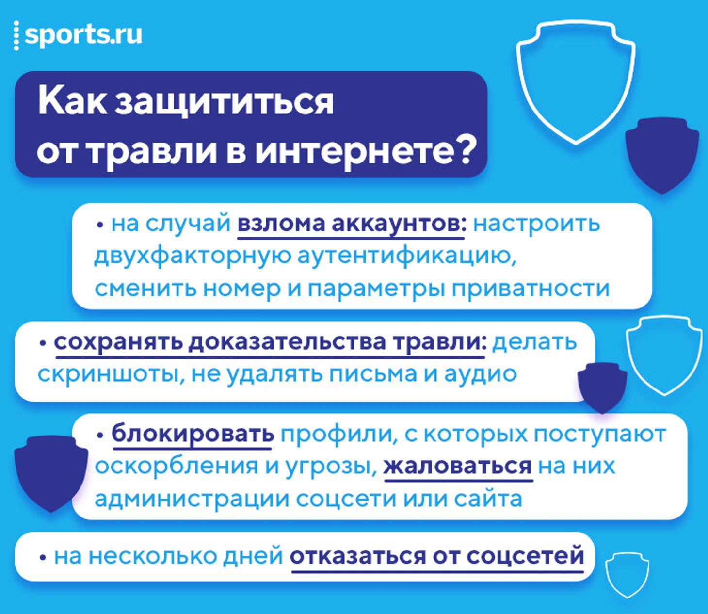 Борьба с кибербуллингом особенно забавно выглядит, учитывая, что абсолютно у всех людей сейчас есть возможность создать закрытый аккаунт. Но нет, спортсмены предпочитают держать многомиллионные аккаунты, высасывая из подписчиков каждую копейку, но не согласны с тем, что 0,1% аудитории будут писать им нехорошие вещи в интернете.