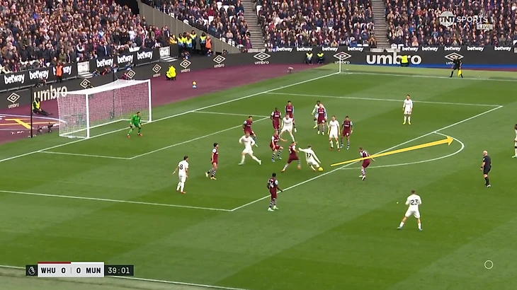 Здесь видна некоторая несыгранность. Можно заметить, как Хойлунд несколько притормозил и стартанул уже только после паса Антони и если бы сделал свой рывок чуть раньше, в момент паса или чуть ранее, то скорее всего успел бы замкнуть.