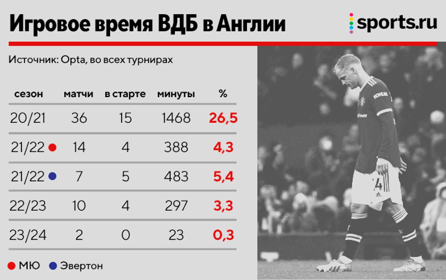 Назначение Тен Хага, у которого Донни показывал лучший футбол, не помогло. ВДБ по-прежнему получал минуты только в концовках. Перед ЧМ-2022 Тен Хаг трижды выпускал Донни в старте, но всегда менял после часа. На вопросы о будущем отвечал стандартно: «С тактической точки зрения он делает все, что от него требуется – прессинг, переход из обороны в атаку. Но я знаю, что он способен на большее.