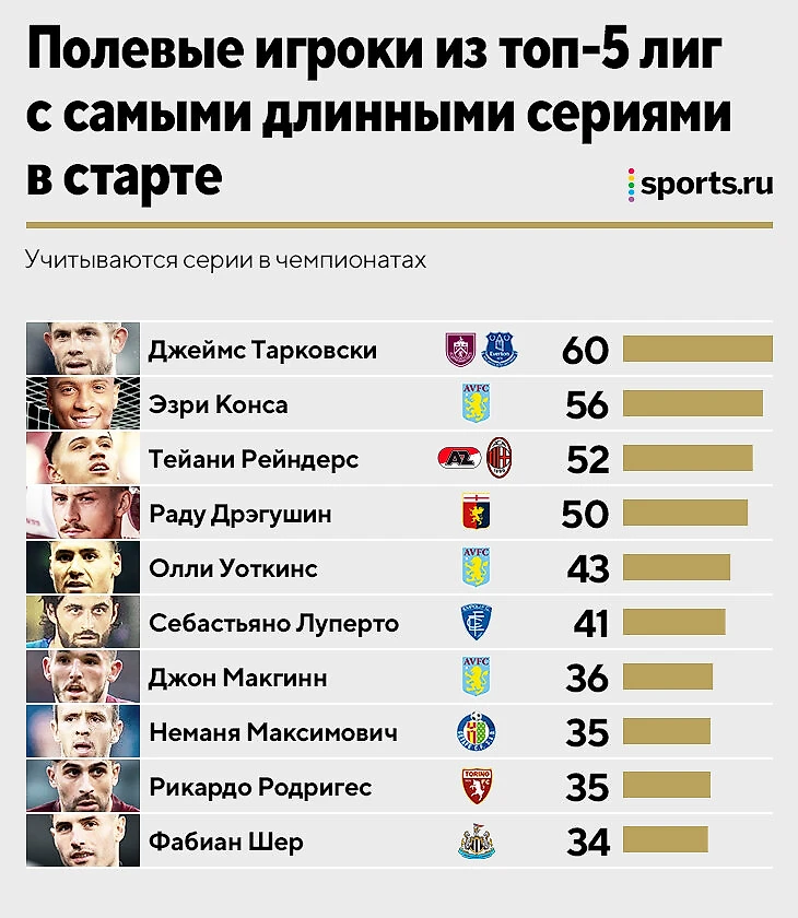 ● В топ-10 сразу три игрока «Астон Виллы»: Эзри Конса, Олли Уоткинс и Джон Макгинн. Конса, как и Тарковски, в прошлом сезоне сыграл во всех матчах, но в одной из игр лишь вышел на замену. Послее нее как раз и начался отсчет попаданий в старт – всего 56.