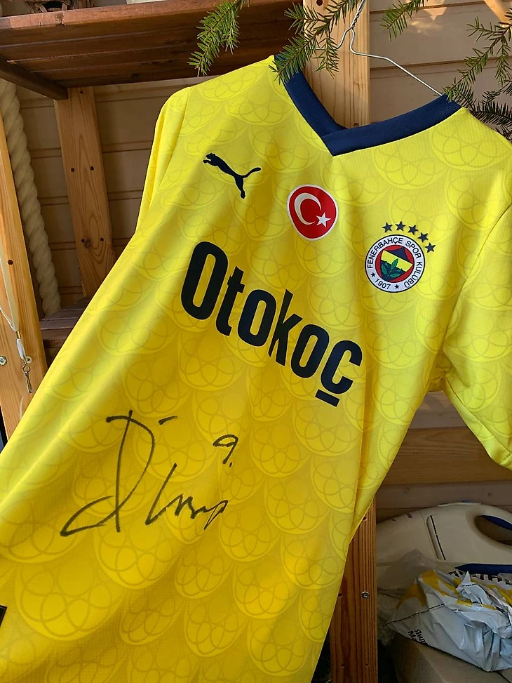 1) Выездная футболка «Фенербахче» сезона 2023/24 с автографом Эдина Джеко (достал её через отель, в котором жила команда, когда «Фенер» летом приезжал в Питер играть товарняки). Размер S. На спине есть несколько черных точек от маркера – возможно, Эдин выбирал, где лучше расписаться.