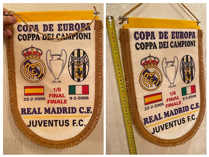 Оригинальный матчевый вымпел Лиги чемпионов 2006, 1/8 финала, «Реал» — «Ювентус». Настоящий полноразмерный вымпел, приобретённый прямо перед матчем, высотой в 40 сантиметров, который украсит ваш интерьер, коллекцию или любимый спорт-бар.