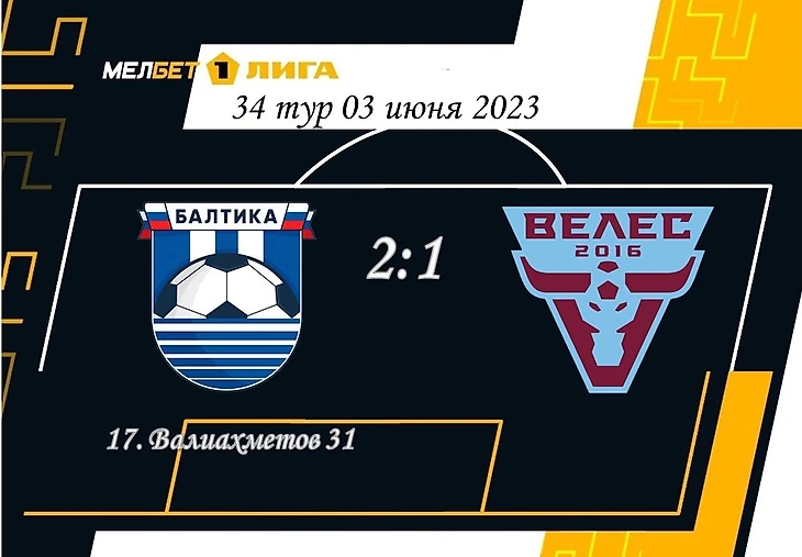 Последняя игра напоминала выпускной, в котором балтийцы прощаются со ставшей родной лигой. В основе хозяев в официально своих последних матчах за «Балтику» вышли Кашчелан, Кленкин и Тишкин. «Велес», имевший крохотные шансы на спасение, в самой середке первого тайма открыл счет. На получасовой отметке Игнашевич произвел двойную замену – в том числе поле покинул Валиахметов.