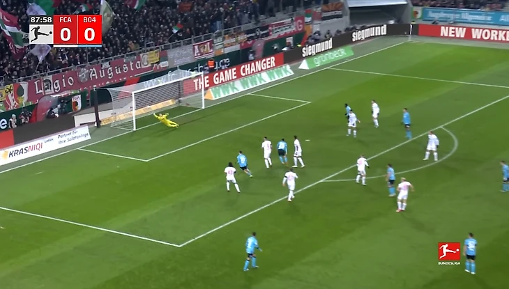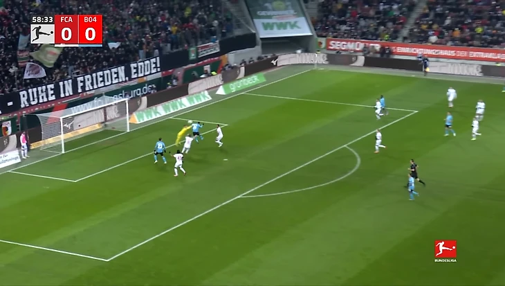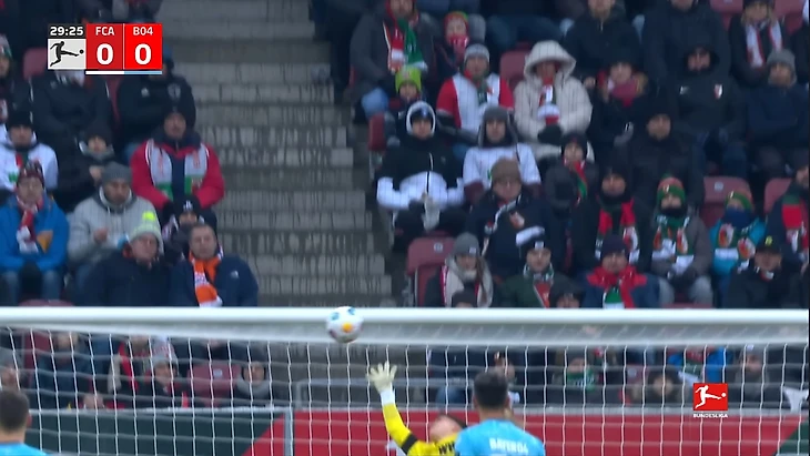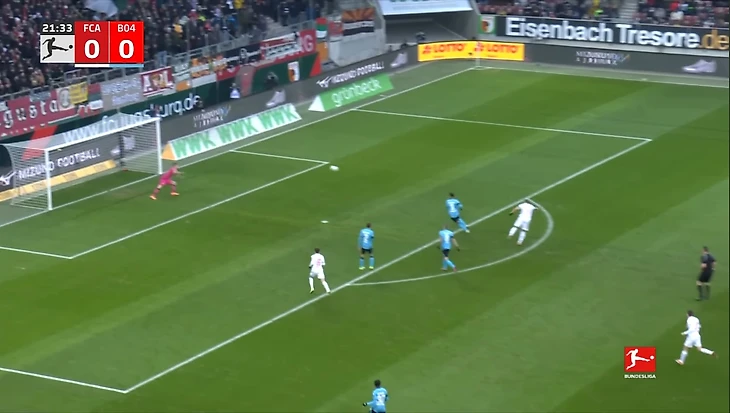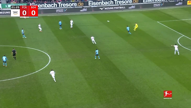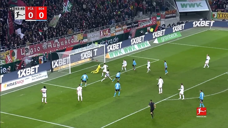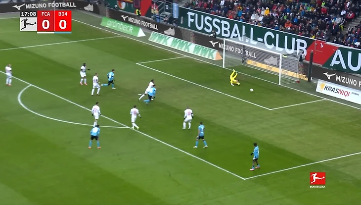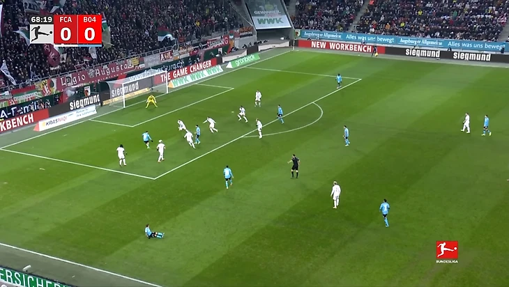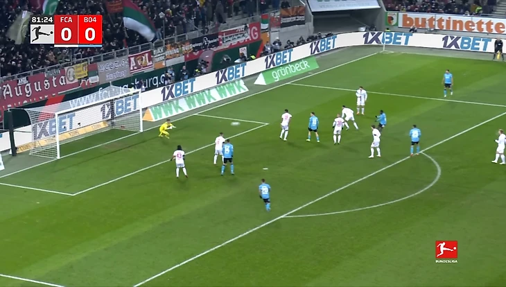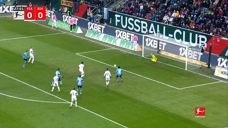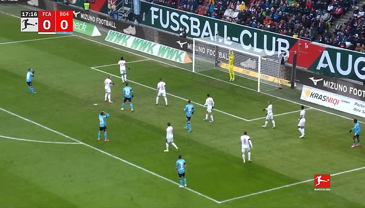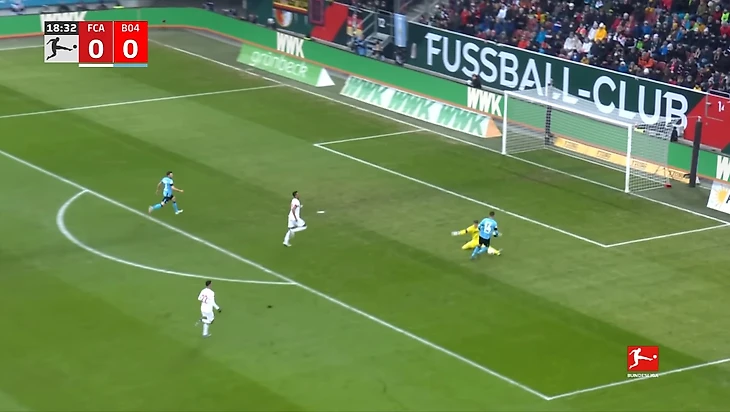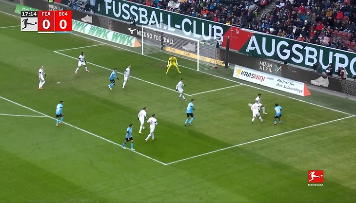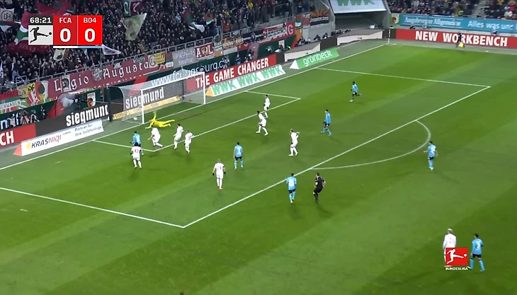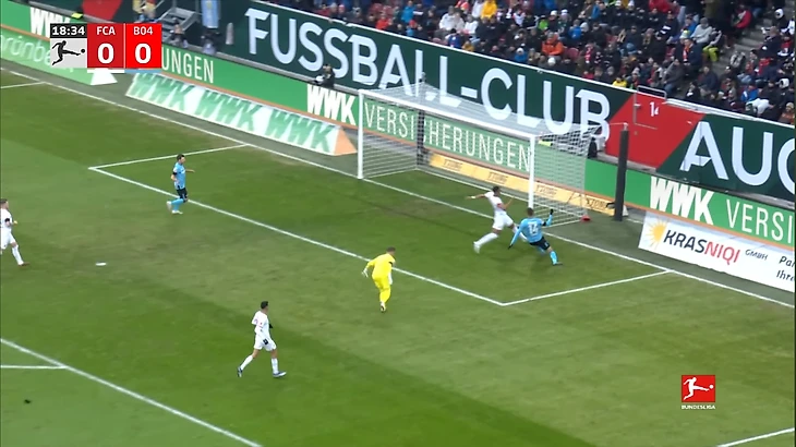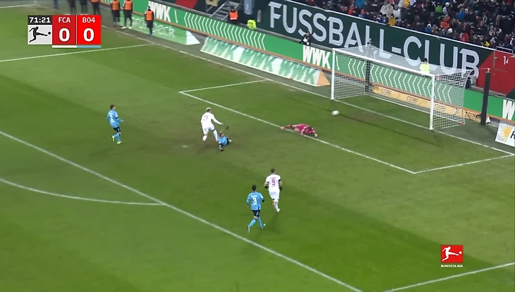 Три минуты спустя Градецки пришлось спасать ворота. Игрок «Аугсбурга» Филип Тиц передачей за спину защитникам был выведен на ударную позицию и протолкнул мяч мимо вратаря «Байера 04», но игрок «Аугсбурга» ранее находился в офсайде.