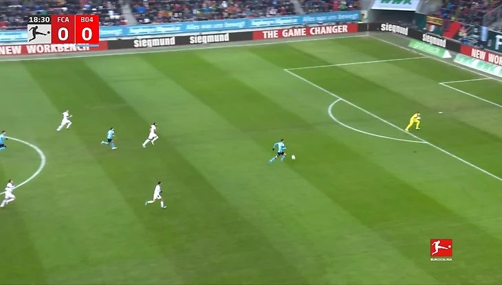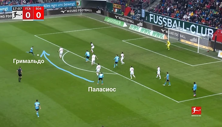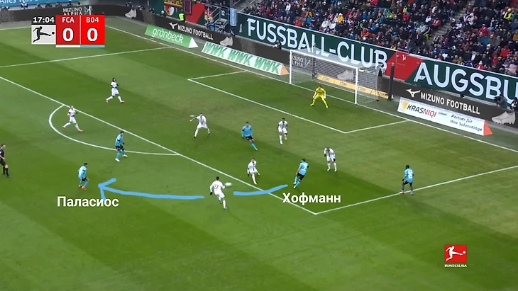 Затем последовала атака «Байера». Хофманн добежал до штрафной «Аугсбурга» и отдал передачу в центр на Паласиоса. Паласиос выкатил на Гримальдо, который пробил по воротам, но Дамен отбил его удар.