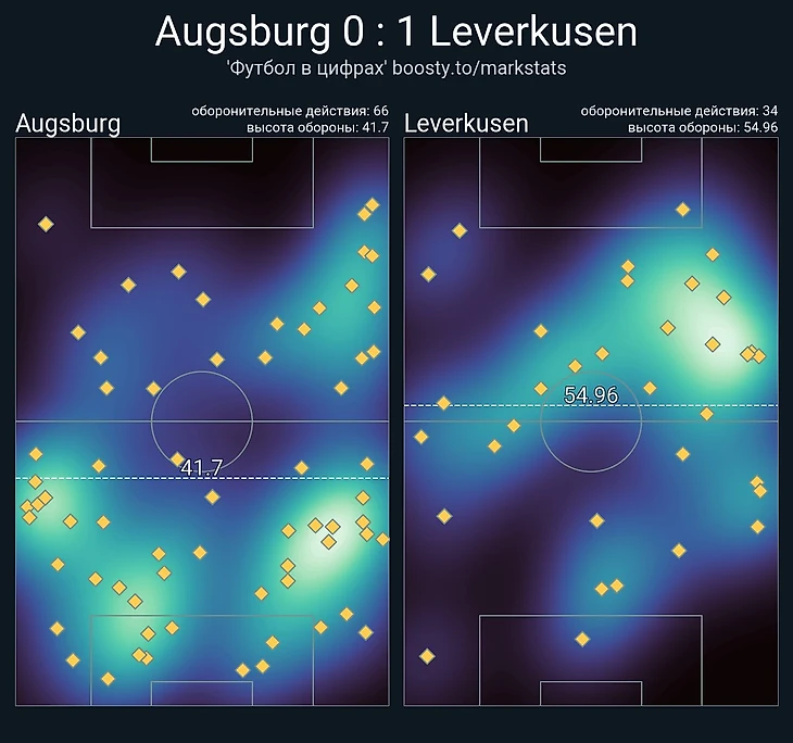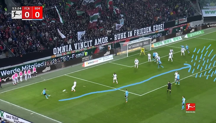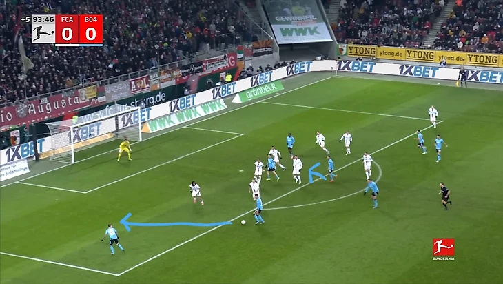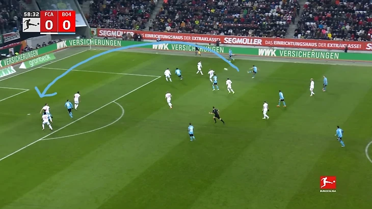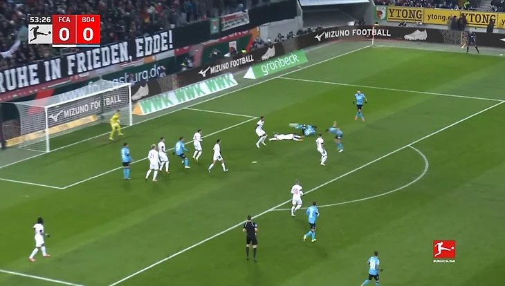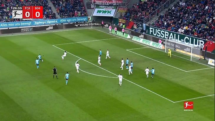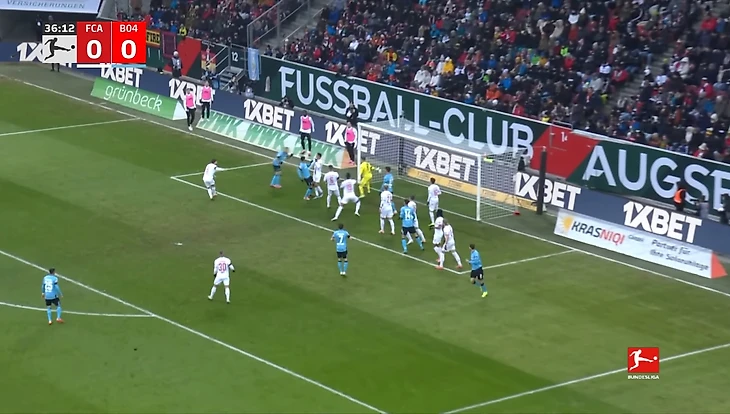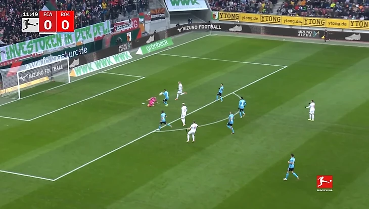 Вот одна из атак «Аугсбурга». Дамен делает длинный заброс в направлении нападающих. Обратите внимание насколько была высокая оборона «Байера». Именно на забросах за спину «Агсбург» пытался взломать Леверкузен.