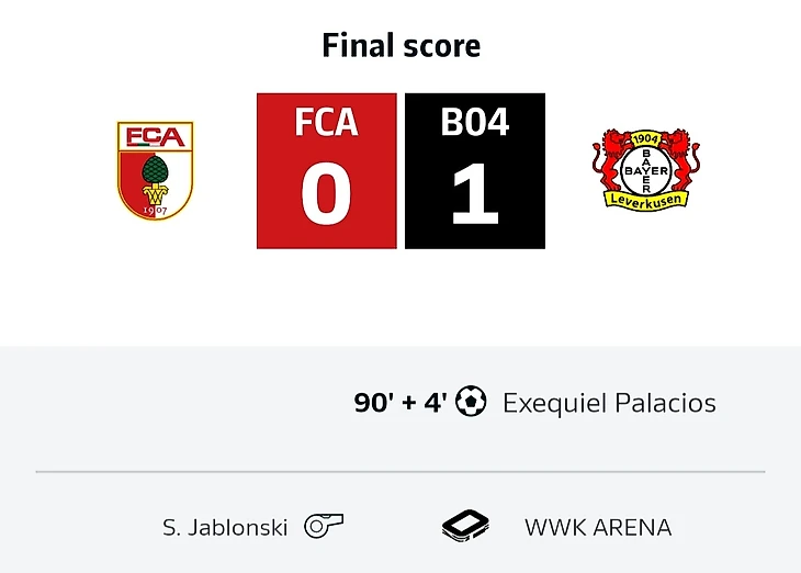 За большие усилия «Байер» был вознаграждён только в конце матча. Леверкузенцы выиграли свою первую игру в 2024 году со счетом 1:0. Эксекиэль Паласиос забил решающий гол в поединке с «Аугсбургом» на последней минуте добавленного времени после того, как «Байер 04» до конца неустанно боролся за лидерство.