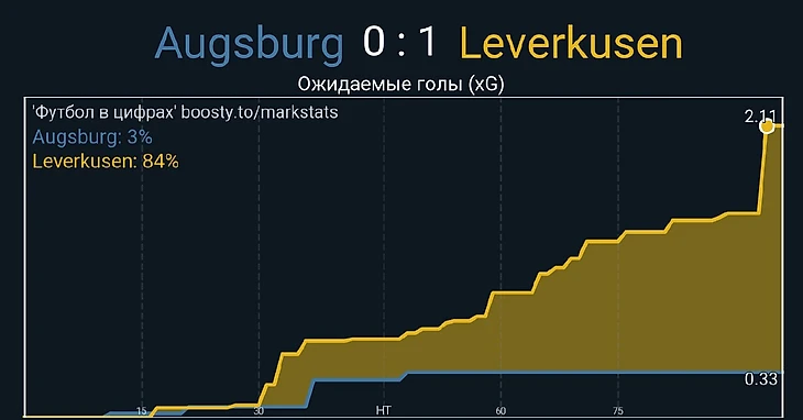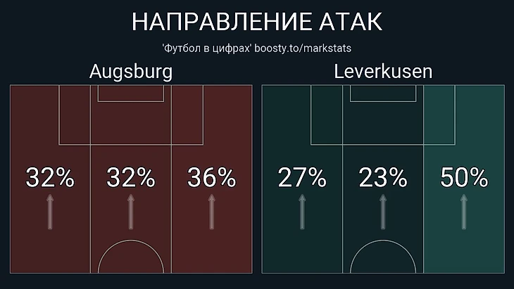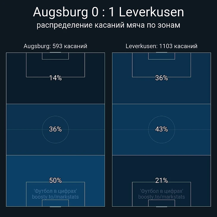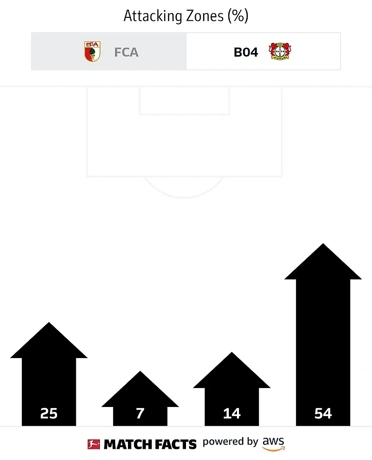 «Байер» продолжал играть вперед, владел мячом на уровне 75% и почти не давал команде «Аугсбурга» времени передохнуть. Однако возможность удара головой от Шика также остались просто возможностью, и первая половина завершилась со счетом 0:0.