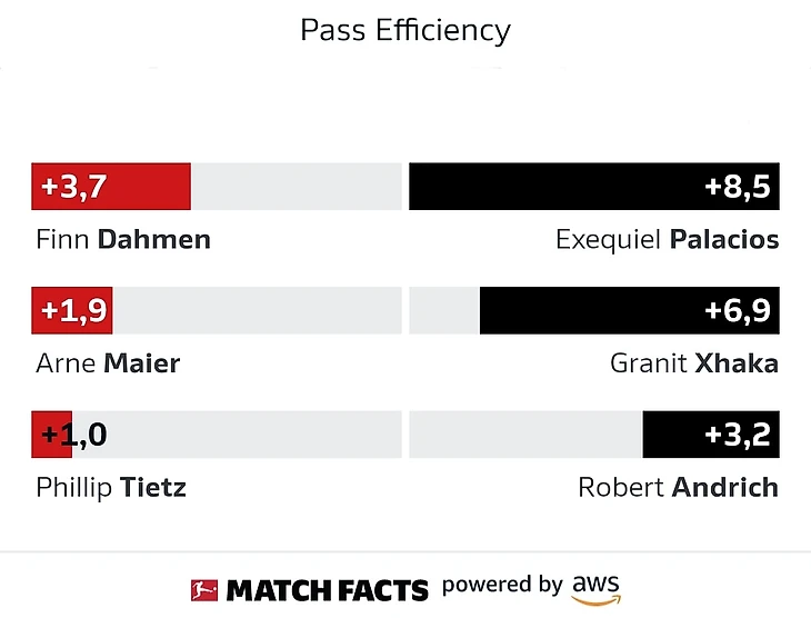 «Байер-04» далеко впереди по обеим статистикам: 673 передачи за игру, 596 из которых успешные, являются лучшими показателями в лиге, а 60,7% владения мячом означает второе место среди всех команд Бундеслиги.