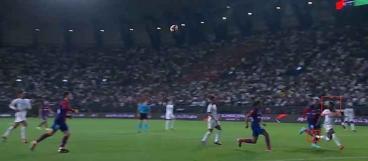 Затем Араухо кладет руку на плечо/шею Вини и случайно (я признаю, что случайно), коленом задевает левую пятку Вини. Обратите внимание, что на первой картинке Араухо слева от Вини, а на второй он уже ближе к правому плечу. Он скрестил траекторию, пытаясь оказаться между мячом и Винисиусом. И из-за этого он и зацепил пятку Винисиуса.