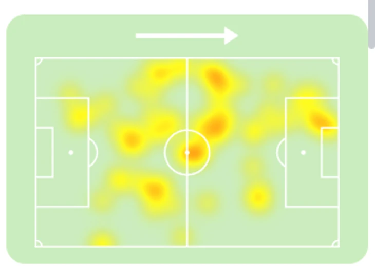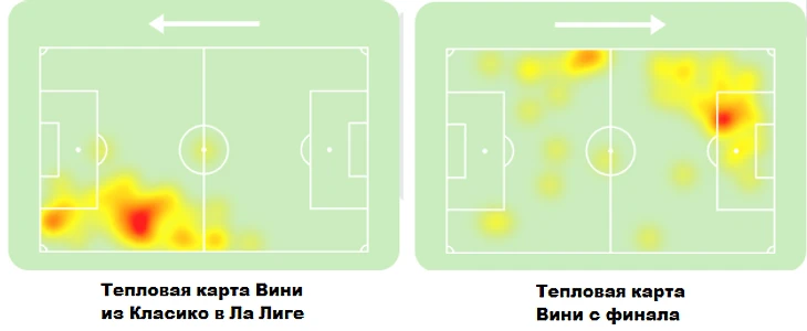 По тепловой карте явно видна разница. В Ла Лиге Вини играл, как раньше, строго на фланге. И это было на руку Араухо.