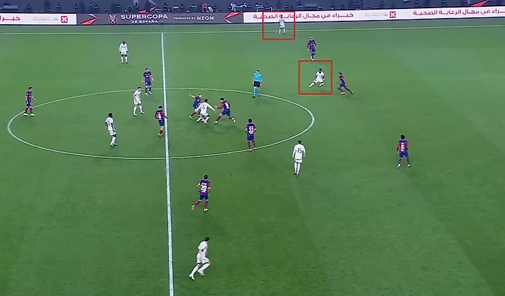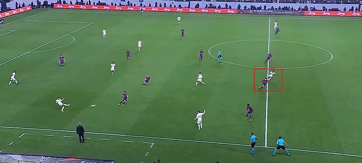 В этот раз Родриго идеально забежал, выдержав линию офсайда. А пас отдавал Карвахаль со своей половины поля. Тут обошлось без каких-либо помарок. Образцовая быстрая и вертикальная атака, в которой Мадрид снова воспользовался высокой линией обороны Барселоны. Родриго убежал и точно в темп Вини, который в подкате закатил мяч в ворота Пеньи.