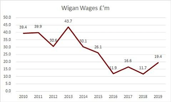 В сезоне 2017/18 «Уиган» выплачивал 176 фунтов зарплаты на каждые 100 фунтов дохода. Средний показатель по Лиге 1 - 89 фунтов на каждые 100 фунтов дохода.