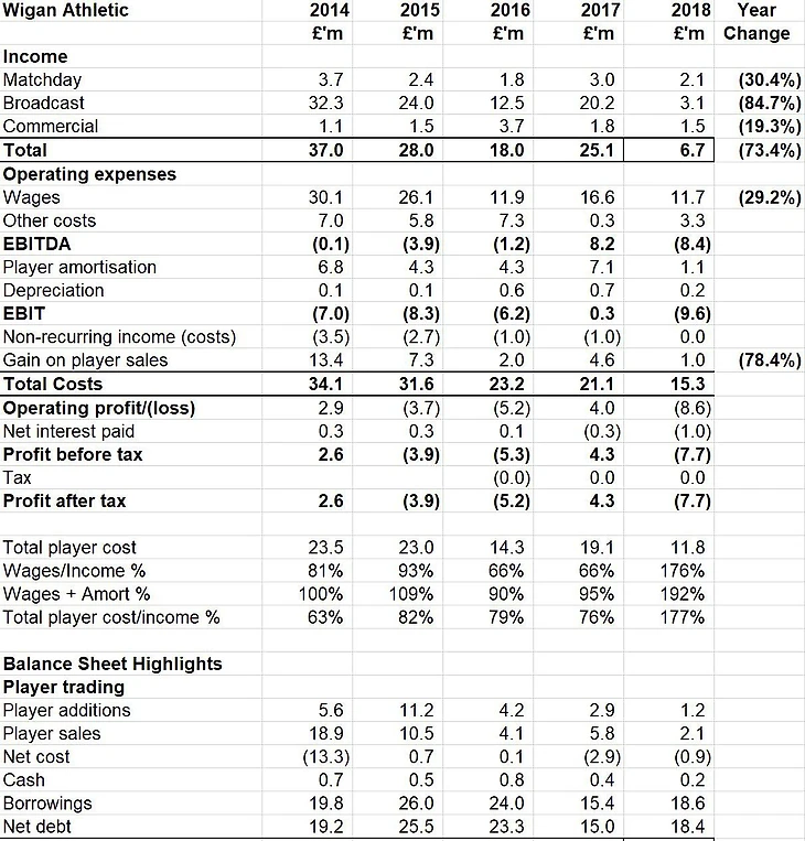 Доходы «Уигана» от телетрансляций упали с 32 миллионов до 3 миллионов с 2013 года. Обратите внимание на 2017 - доход непривычно большой. Важность Кубка Англии для клубов низших лиг подчеркивается успехом клуба в том сезоне, так как проход в 1/4 принес клубу 1/3 всех доходов от телетрансляций. В 2014 году доход от телеправ составлял 15-30% для большинства клубов Чемпионшипа. Для «Уигана» эта часть дохода составляла 80% от всего числа.