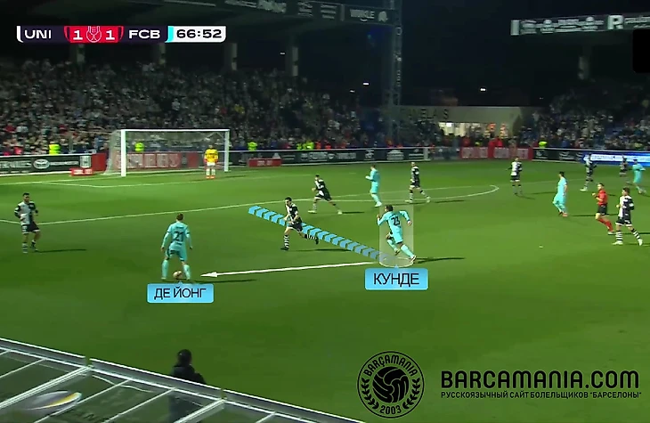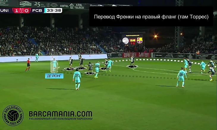 Тут всё упиралось в креатив «Барсы» во вскрытии мега-автобуса – нельзя сказать, что с этим было всё здорово. Один из классических приёмов: стягиваться на один фланг, чтобы затем быстро доставить мяч на противоположный – где больше свободы. Так де Йонг пару раз перспективно переводил на Феррана: